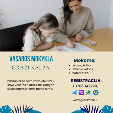 Mokykla "Graži kalba" plečia savo paslaugų portfolio ir 2025 metų vasarą startuoja su nauja paslauga - Vasaros mokykla. Tai skirta išlaikyti vaikų akademinį raštingumą atostogų metu ir leisti tėveliams jaustis ramiau, kad jų vaikai vasarą leidžia turiningai.
